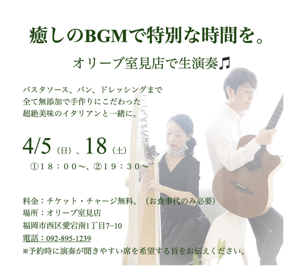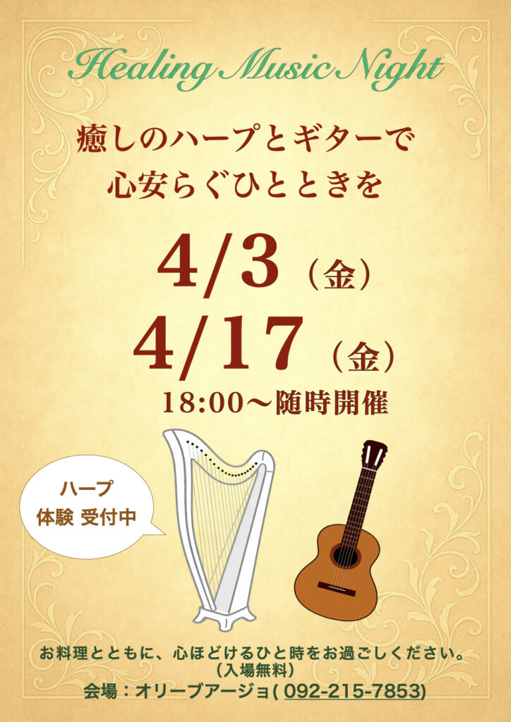 18:00〜22:30の間で、随時ハープ&ギター演奏