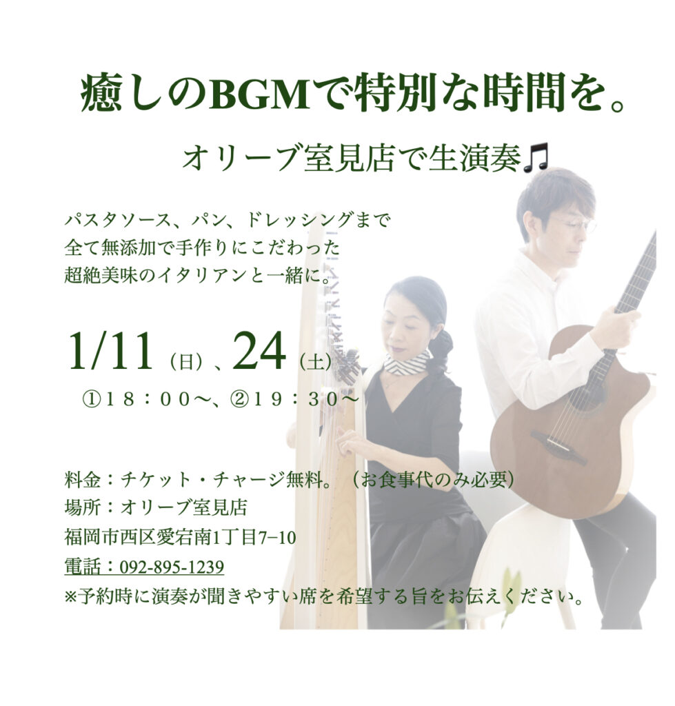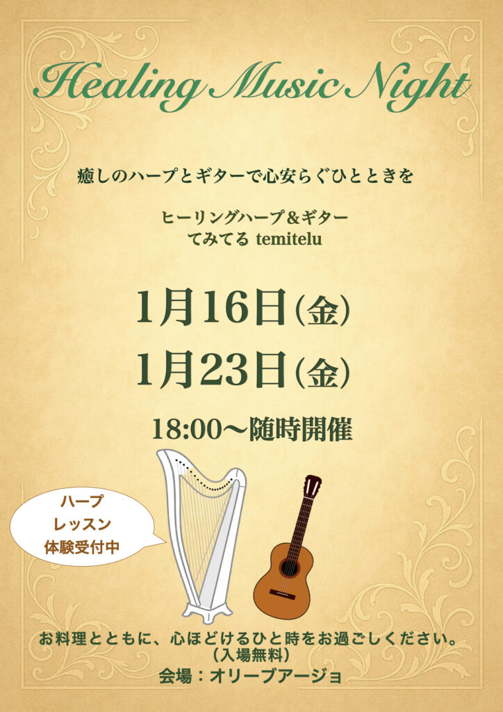 18:00〜22:30の間で、随時ハープ&ギター演奏