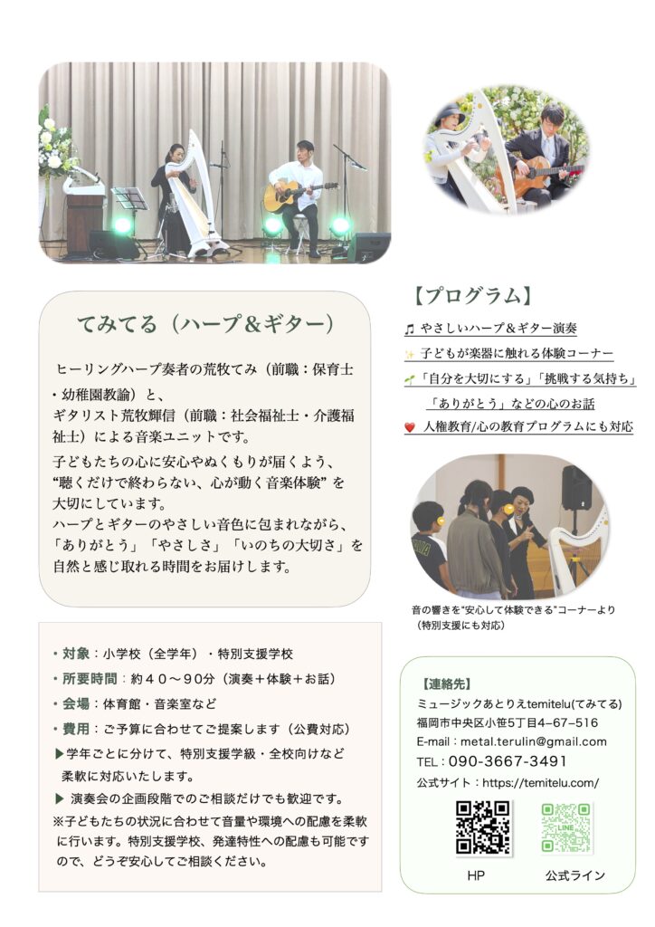 演奏時間:40〜80分程度(演奏+お話+体験)